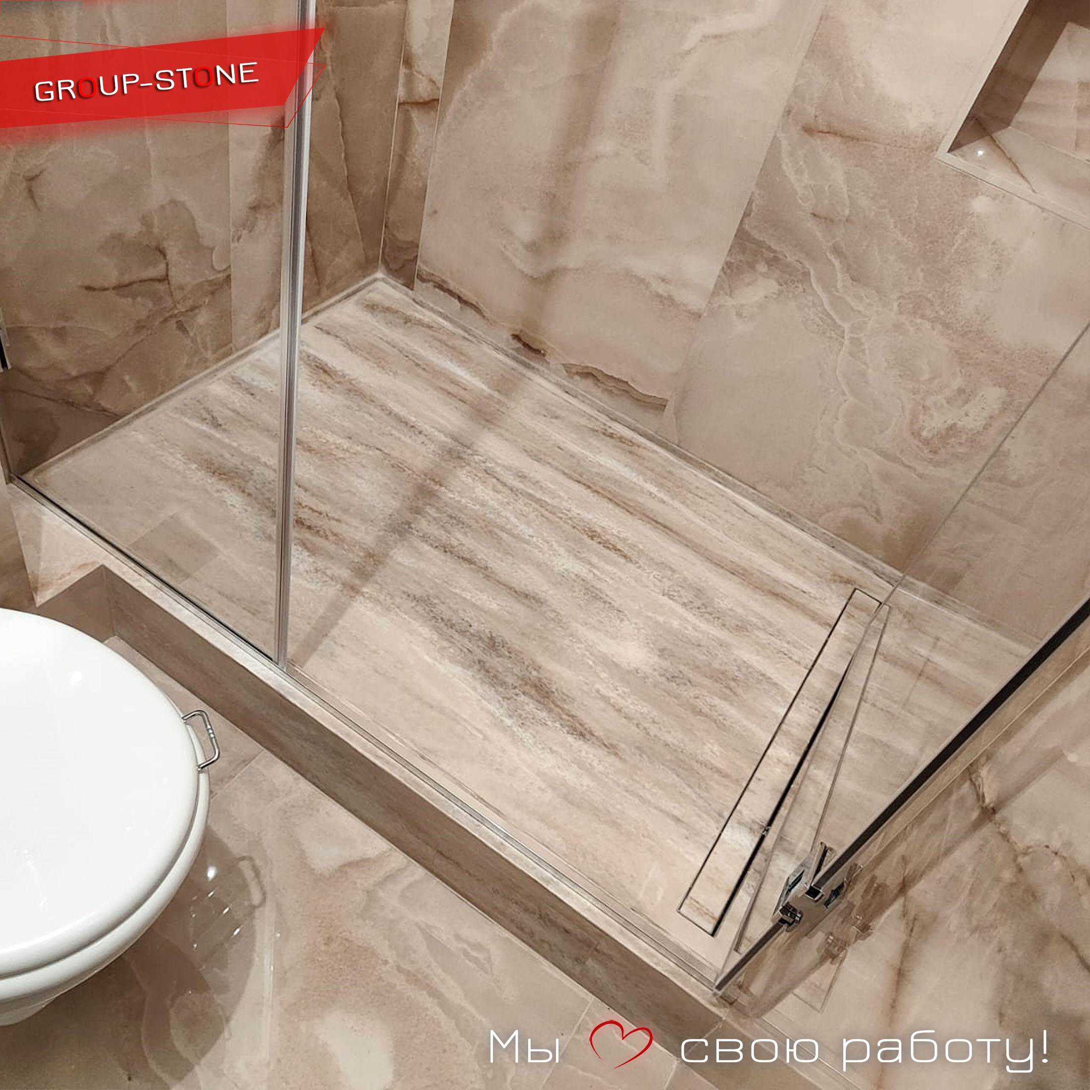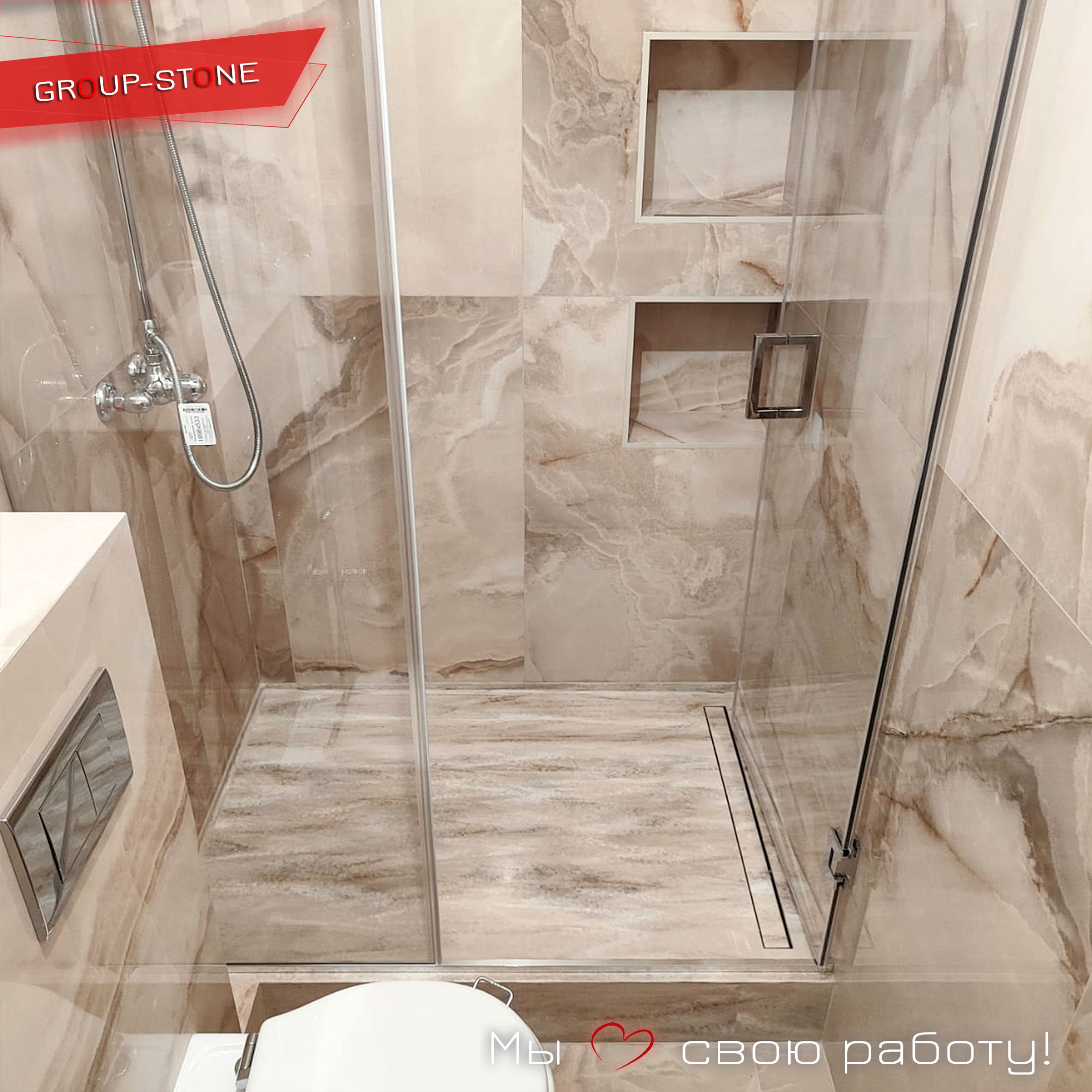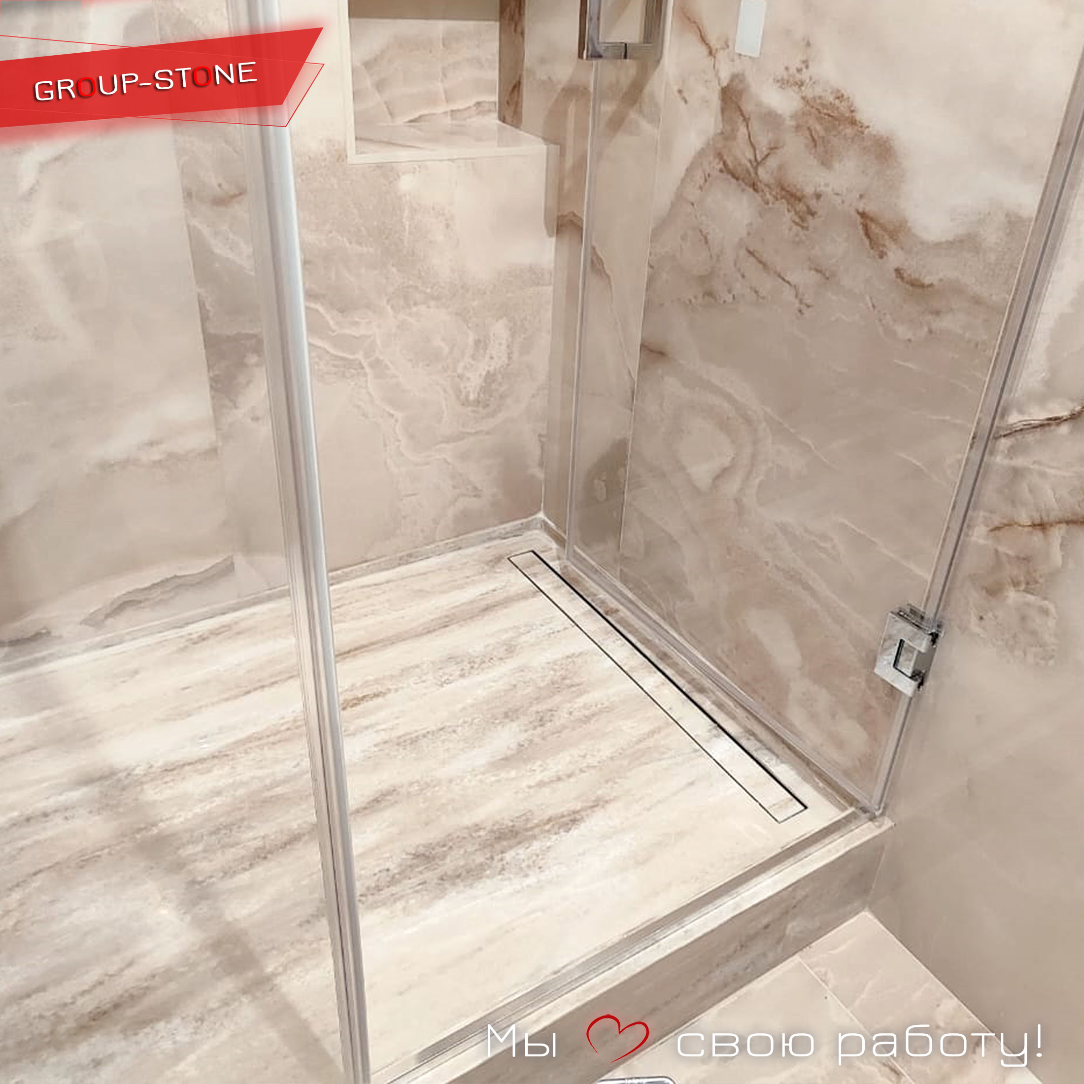 • Современный/хай-тек: Глянцевый или текстурированный камень с металлическими акцентами. Влияние: добавляет технологичности, контрастируя с натуральными элементами. Идея: черный поддон с LED-подсветкой + стеклянные перегородки — ванна как космический корабль.